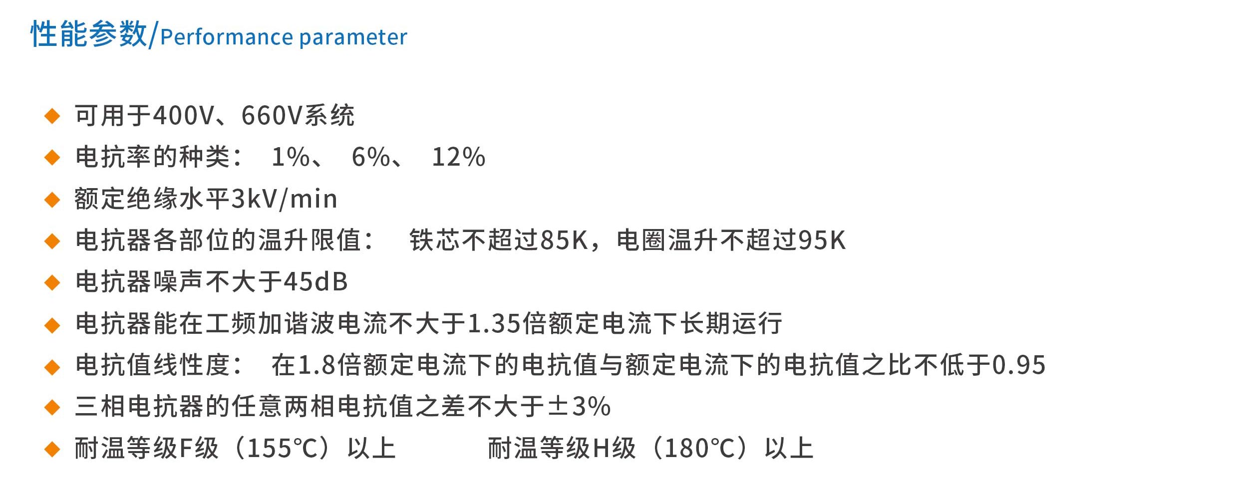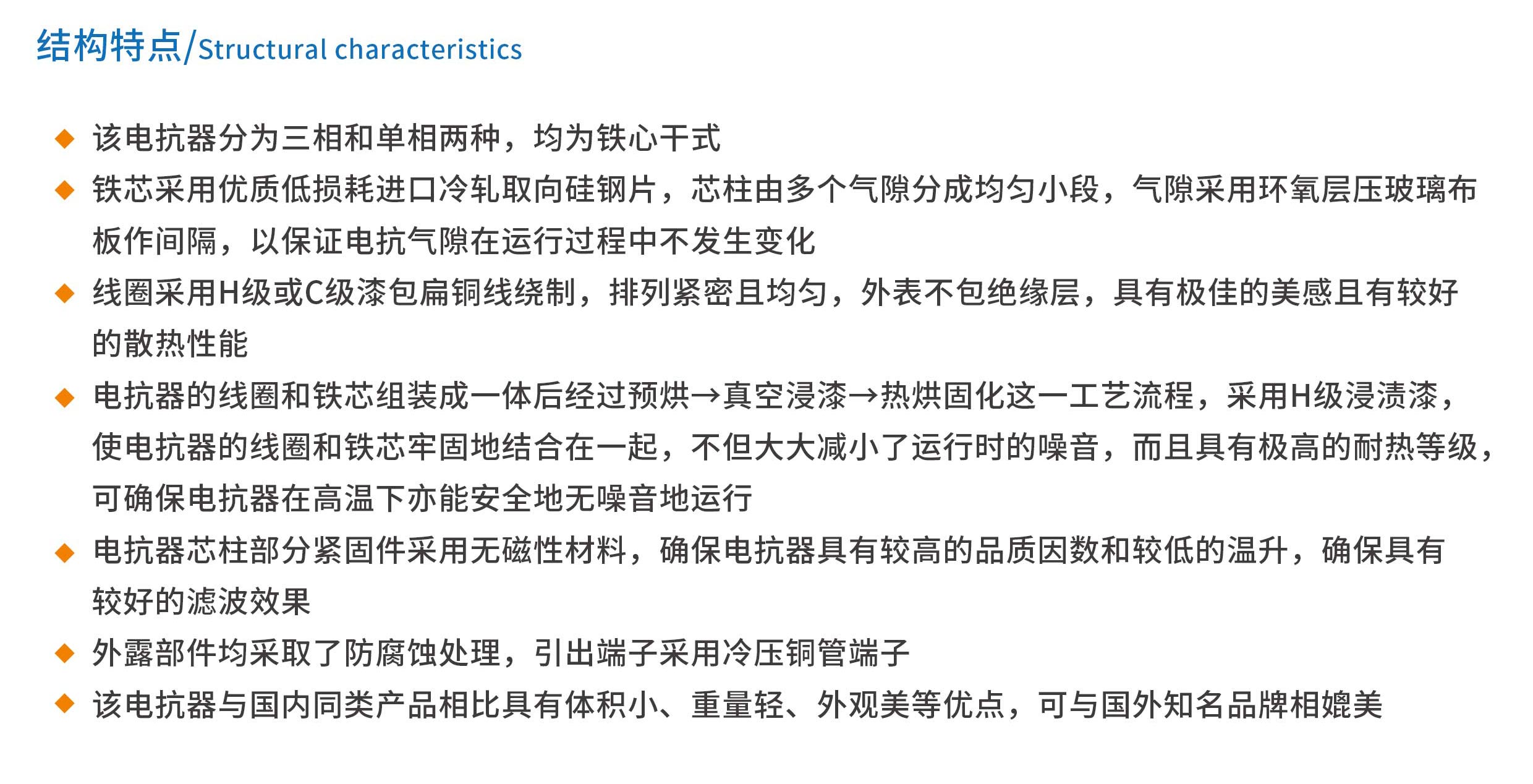 該系列干式鐵芯單相串聯電抗器用于低壓無功補償柜中,與單相電容器相串聯。 當低壓電網中有大量整流、變流裝置等諧波源時,其產生的高次諧波會嚴重危害主變及其它電器設備的安全運行。電抗器與電容器相串聯后,能有效地抑制電網諧波,改善系統的電壓波形,提高系統的功率因數,并能有效地減小合閘涌流及操作過電壓,保證了電容器的安全運行。鐵心采用優質低損耗冷軋硅鋼片,鐵心柱由多個氣隙分成均勻小段氣隙采用環氧層壓玻璃布板作間隔,氣隙間及鐵餅與鐵軛間采用耐高溫高強度粘接劑粘接,以保證電抗氣隙在運行過程中不發生變化,同時有效減少鐵芯餅之間的震動,從而降低噪升。線圈采用F/H級漆包銅扁線或漆包鋁扁線繞制,排列緊密且均勻,有較好的散熱性能。電抗器的線圈和鐵芯組裝成一體后經過預烘→真空浸漆一熱烘固化這一工藝流程,采用F/H級浸潰漆,使電抗器的線圈和鐵芯豐固地結合在一起,不但減小了運行時的噪聲,而且具有極高的耐熱等級,可確保電抗器在高溫下亦能安全低噪音地運行。